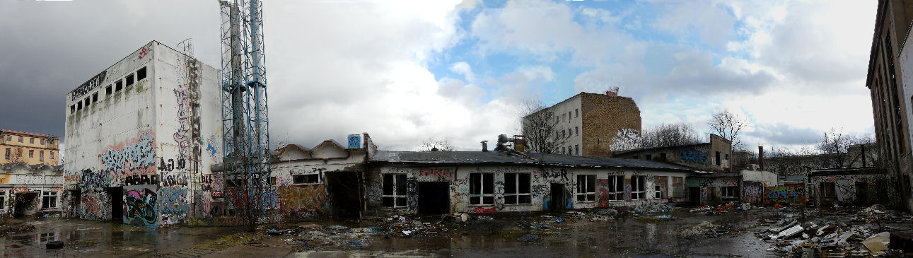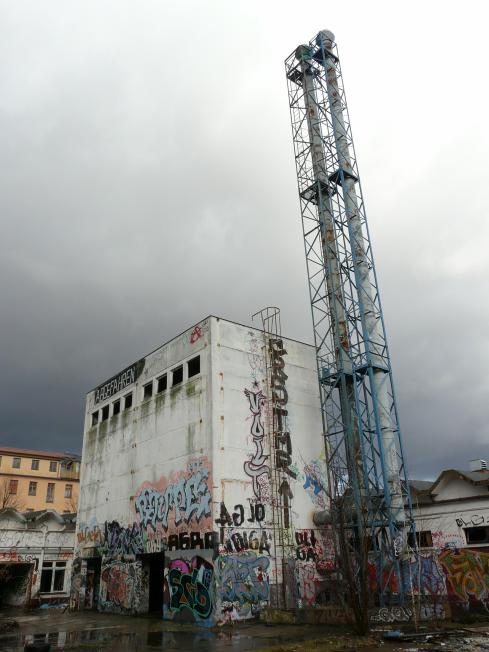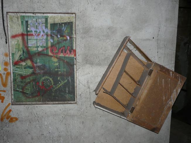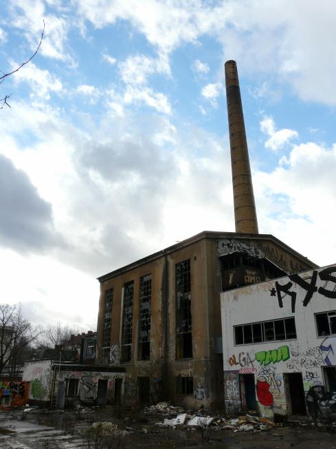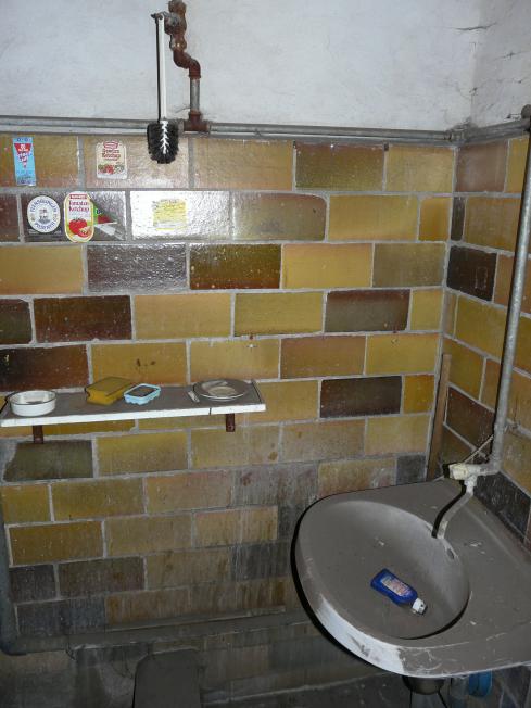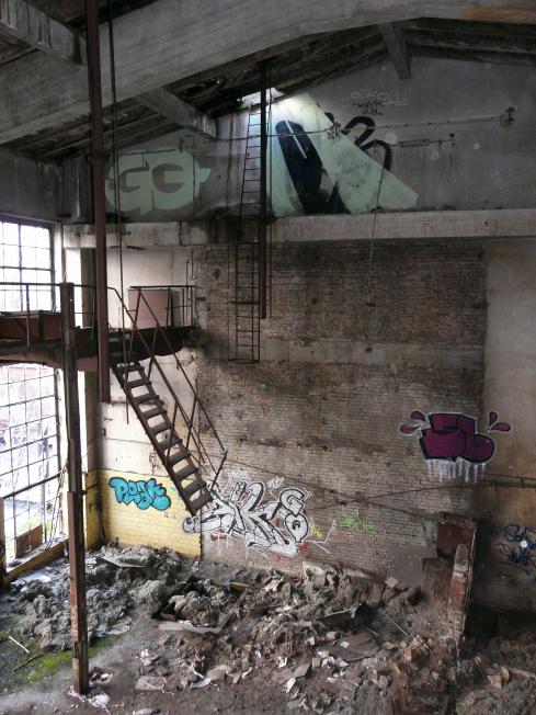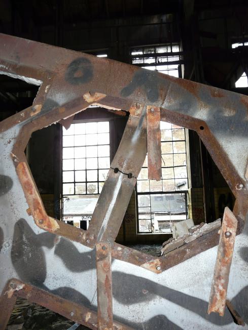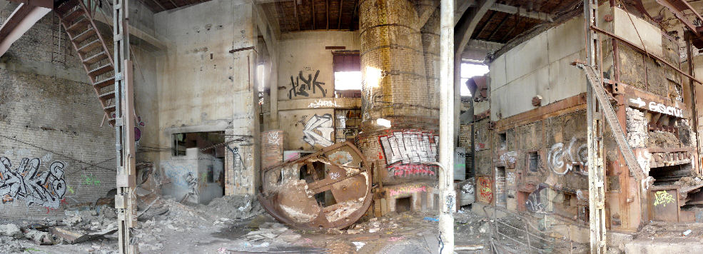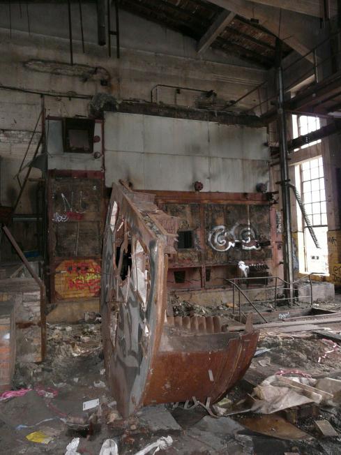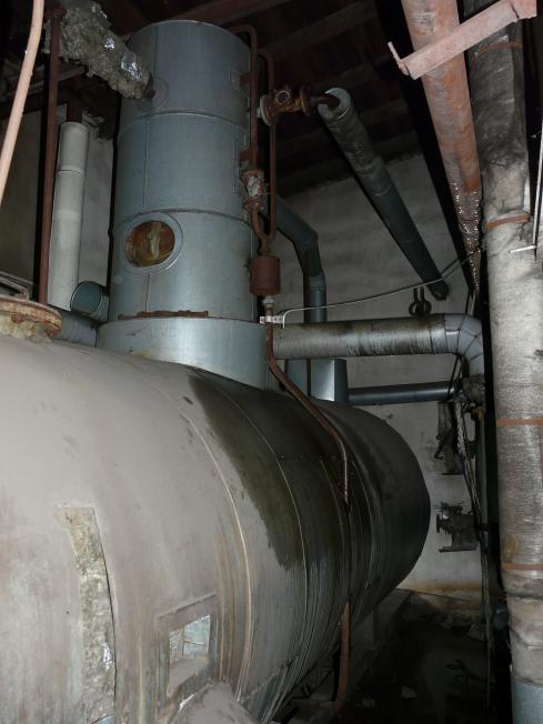 Eine hohe, lichte Halle, Reste eines Kessels und noch ein