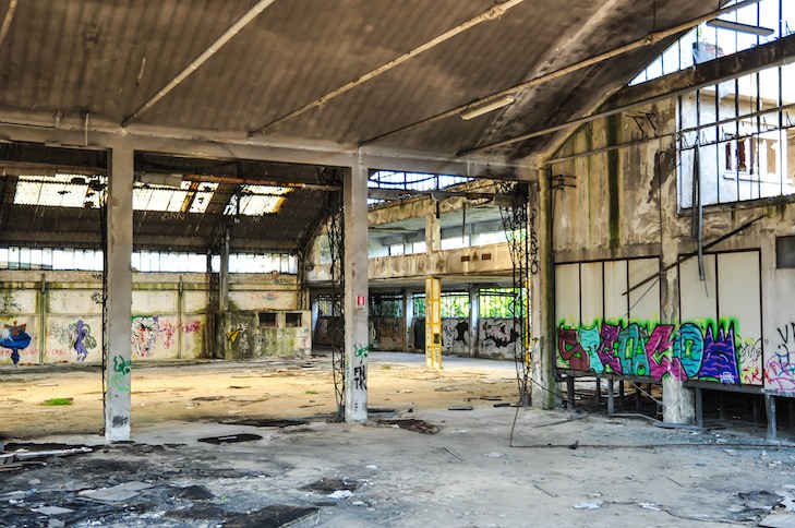 Lagerhallen, funkelnagelneuen Industrieanlagen und grasüberwachsener